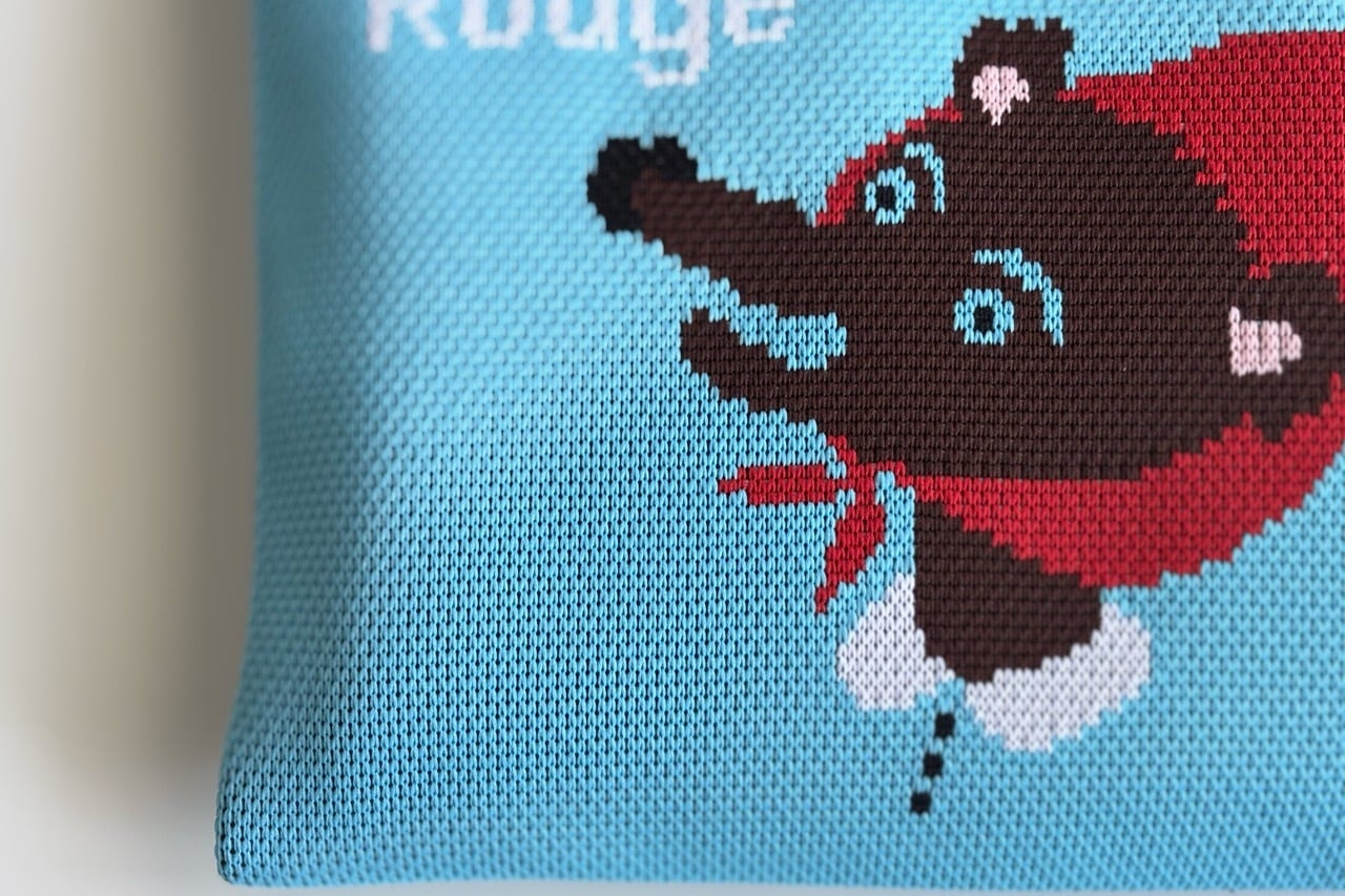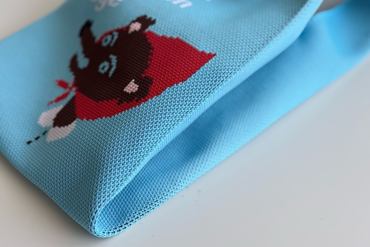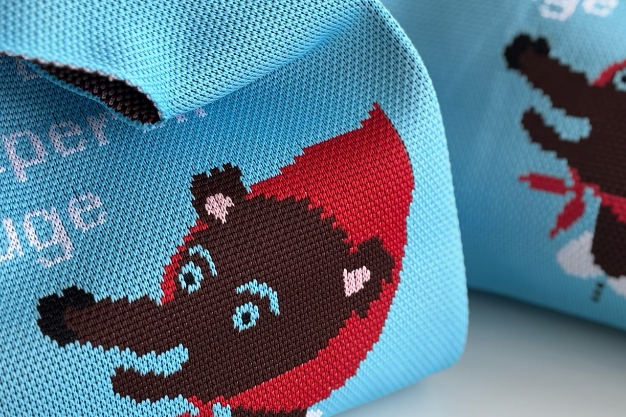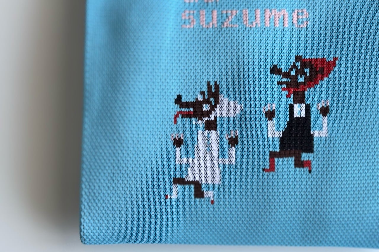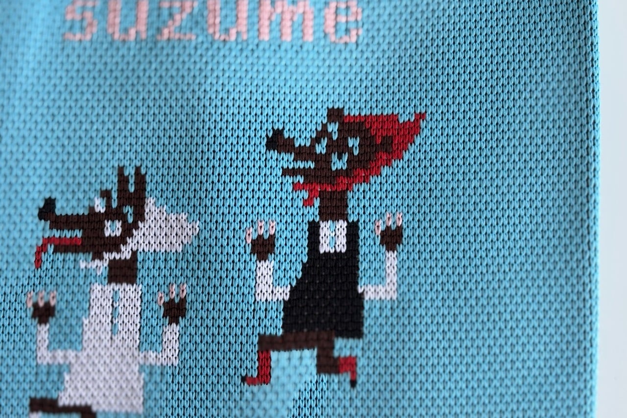 ニットで編まれて作られているので、滑らかな線よりもピクセルのようなおもちゃ感をイメージしてイラストを描き、それを実現していただきました。