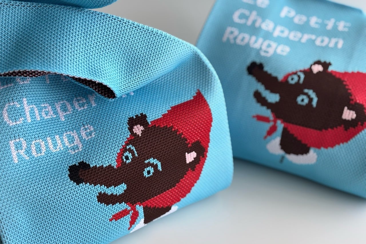 色もスカイブルーとピーコックブルーの中間色で、赤ずきんの赤い色が映えて元気の出るイメージにしました。