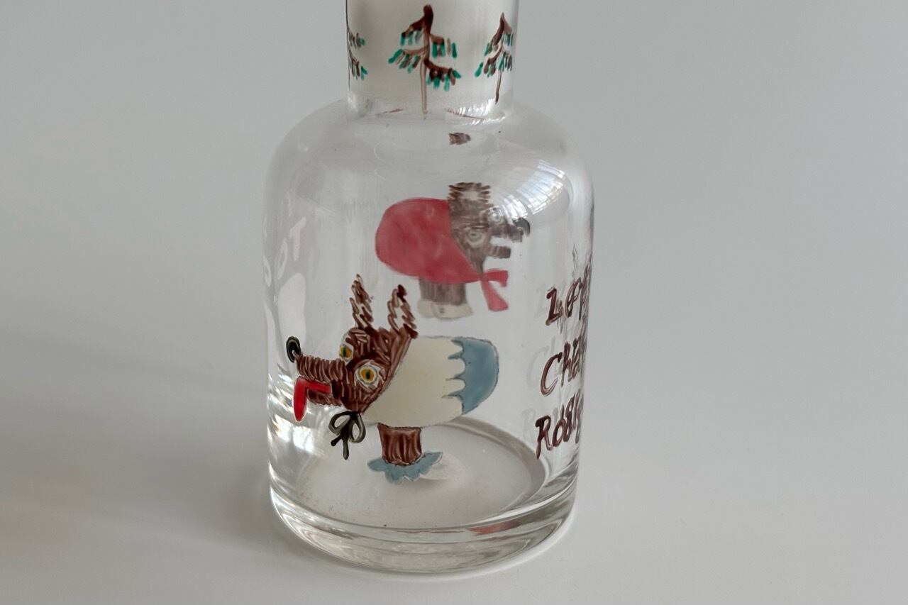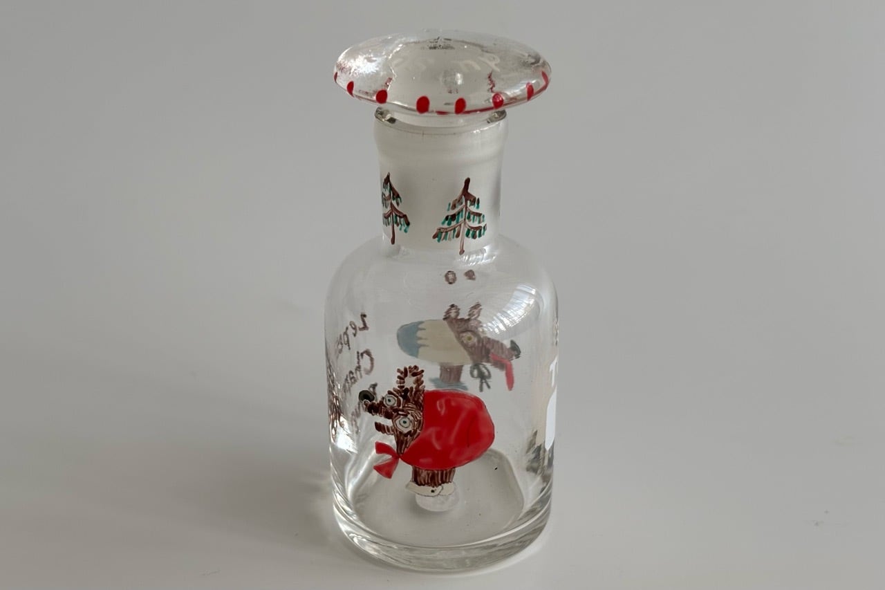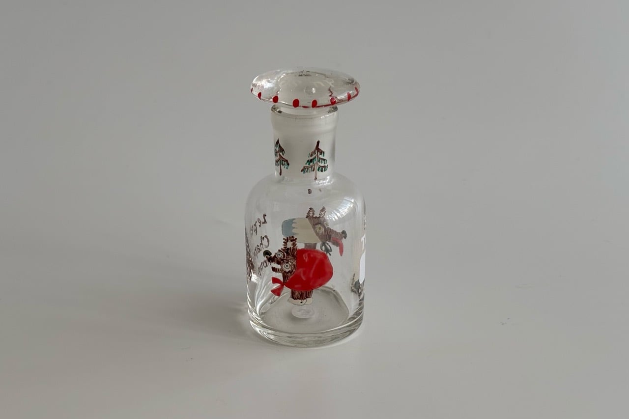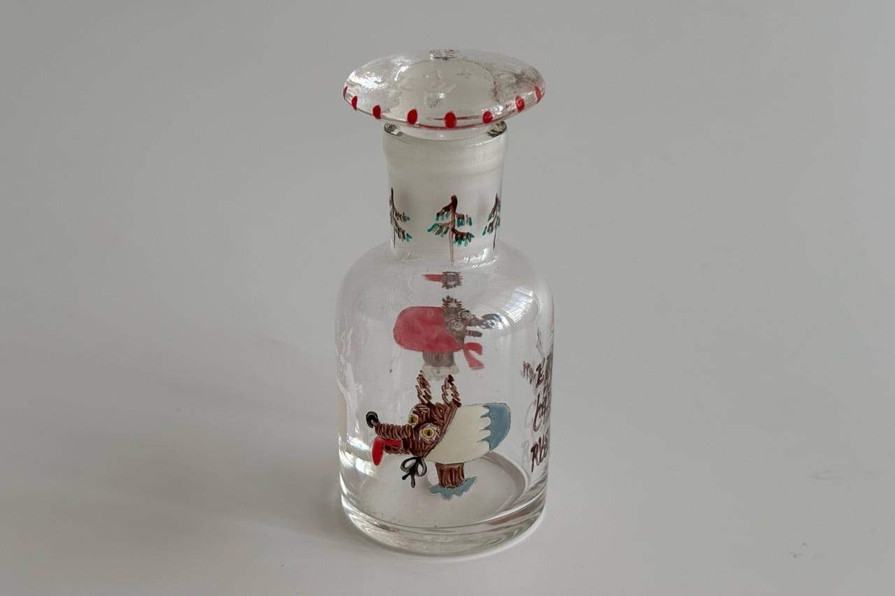 デットストックの古物、蓋付きの試薬瓶にハンドペイントでイラストを描きました。