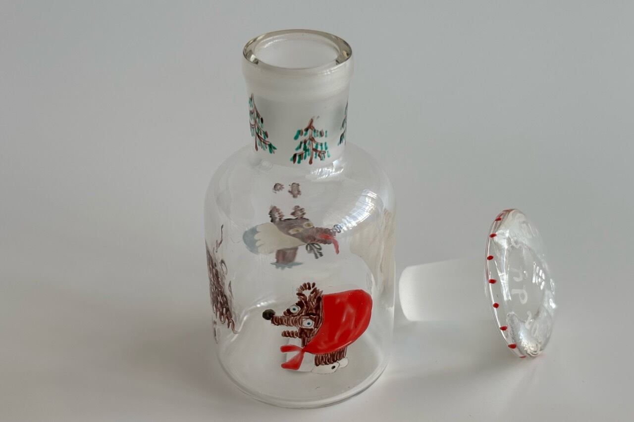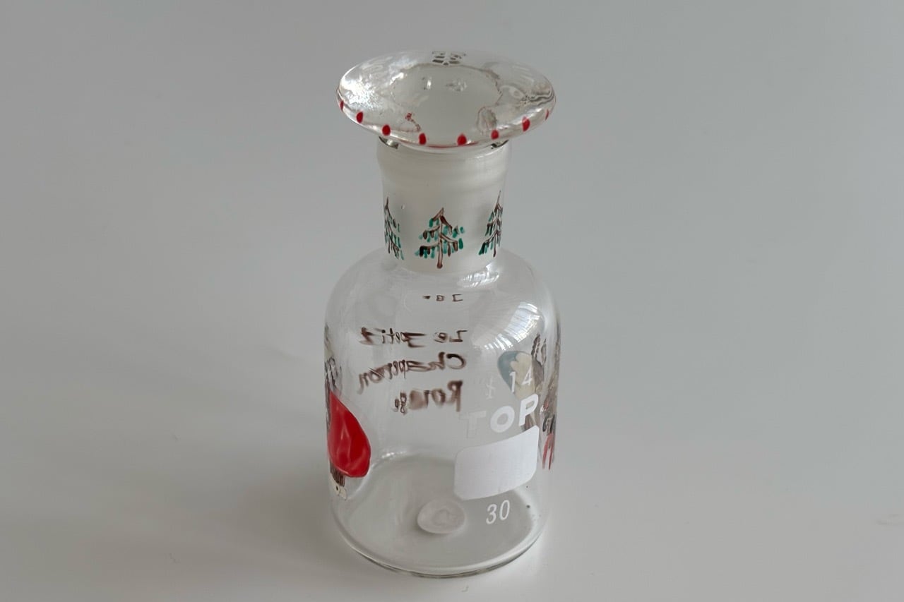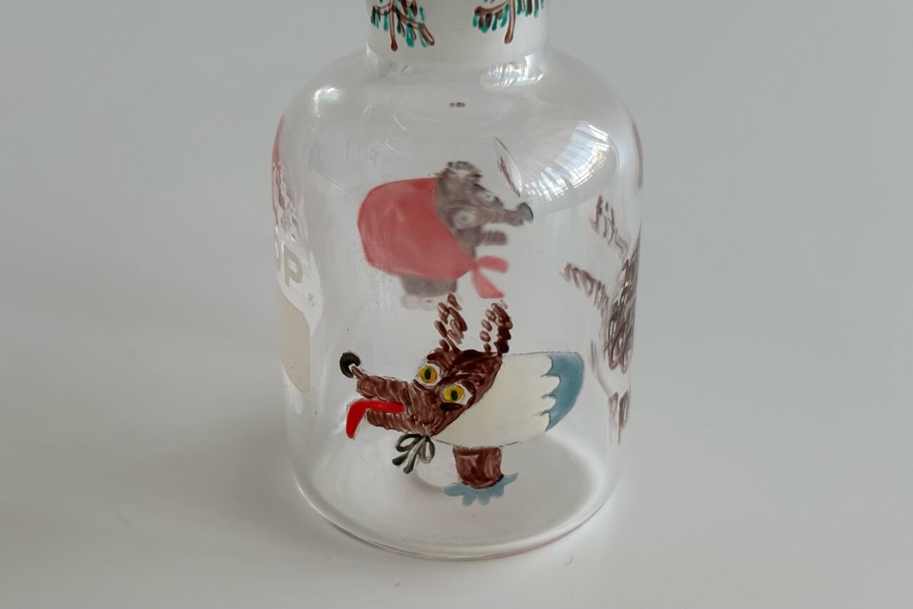 デットストックの古物、蓋付きの試薬瓶にハンドペイントでイラストを描きました。