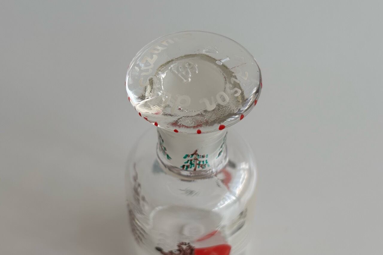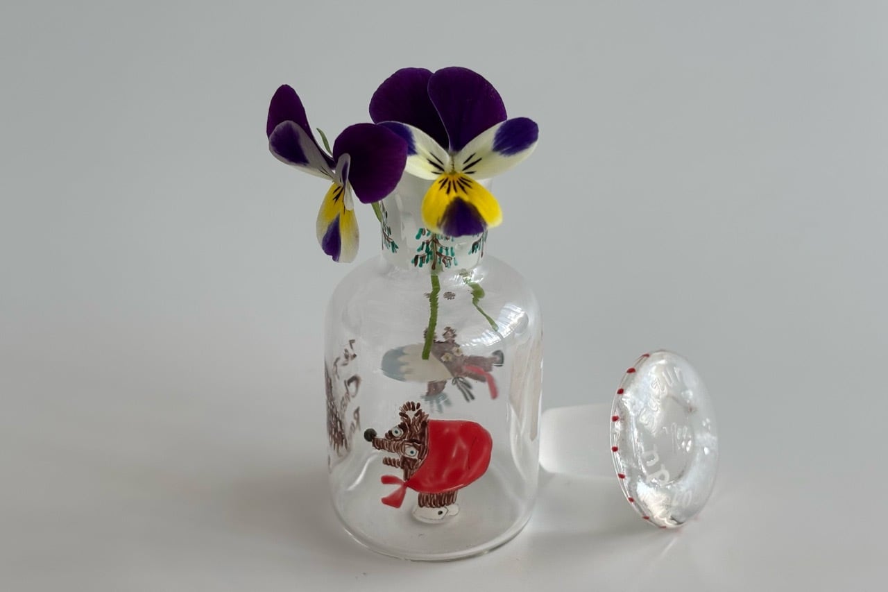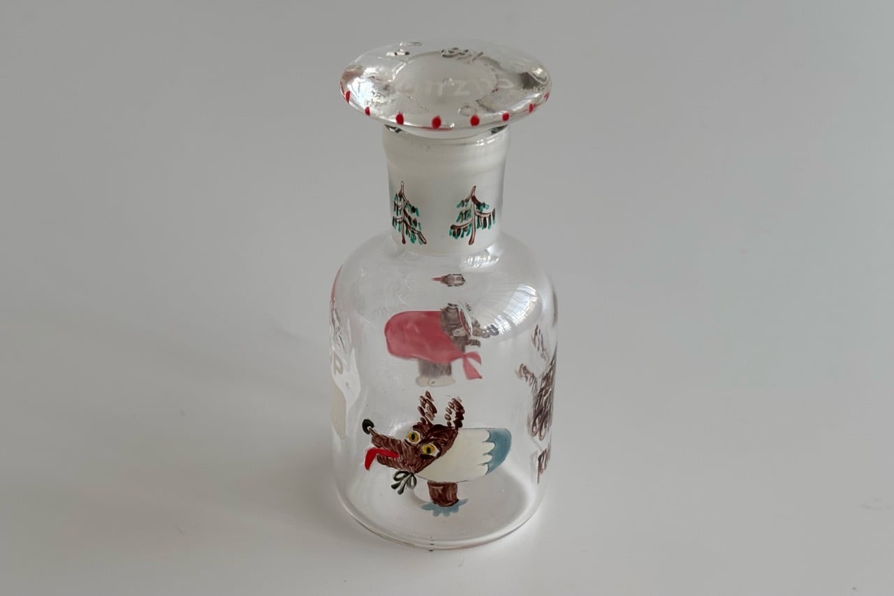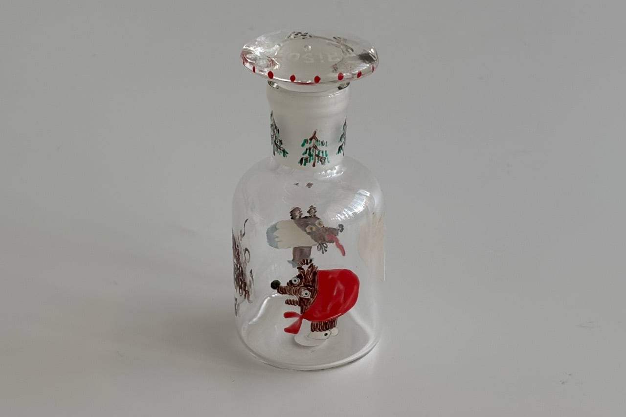 デットストックの古物、蓋付きの試薬瓶にハンドペイントでイラストを描きました。